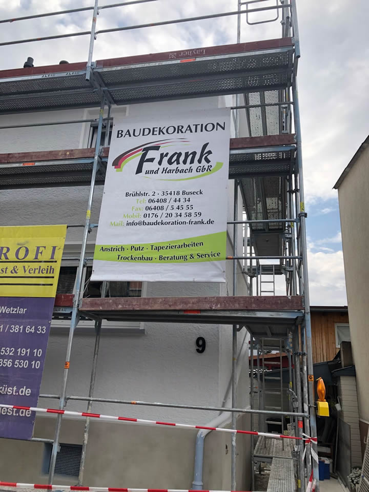Der Malerbetrieb "Frank Baudekoration" wurde 1974 in Großen-Buseck (bei Gießen / in Mittelhessen) von Rolf-Otto Frank gegründet und hat sich seitdem einen hervorragenden Ruf in der Region erarbeitet. Seit 2013 wird das Unternehmen von seinem Sohn Mario Frank weitergeführt und bietet seine Dienstleistungen in Mittelhessen an. Zu den bedienten Orten gehören Großen-Buseck, Gießen, Lollar, Reiskirchen, Lich, Pohlheim, Linden, Grünberg, Hüttenberg, Biebertal und Wetzlar bis Marburg.